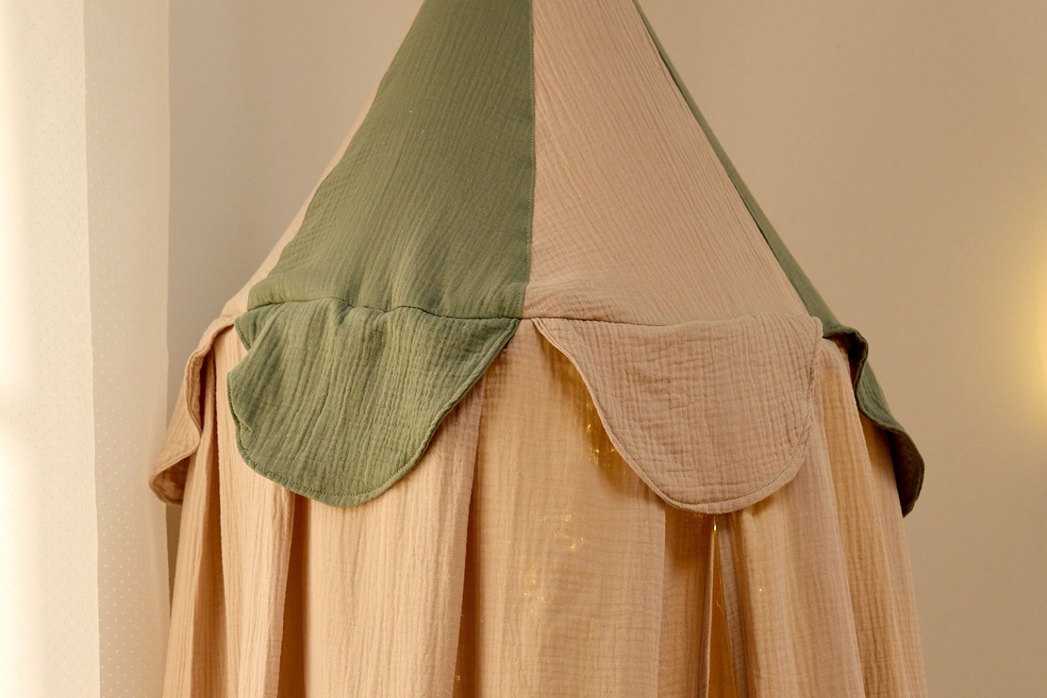 Può essere appeso a un gancio da soffitto (non incluso) o a un supporto speciale. Crea uno spazio tranquillo e chiuso sopra il letto del bambino, fornendo un luogo sicuro per riposare.