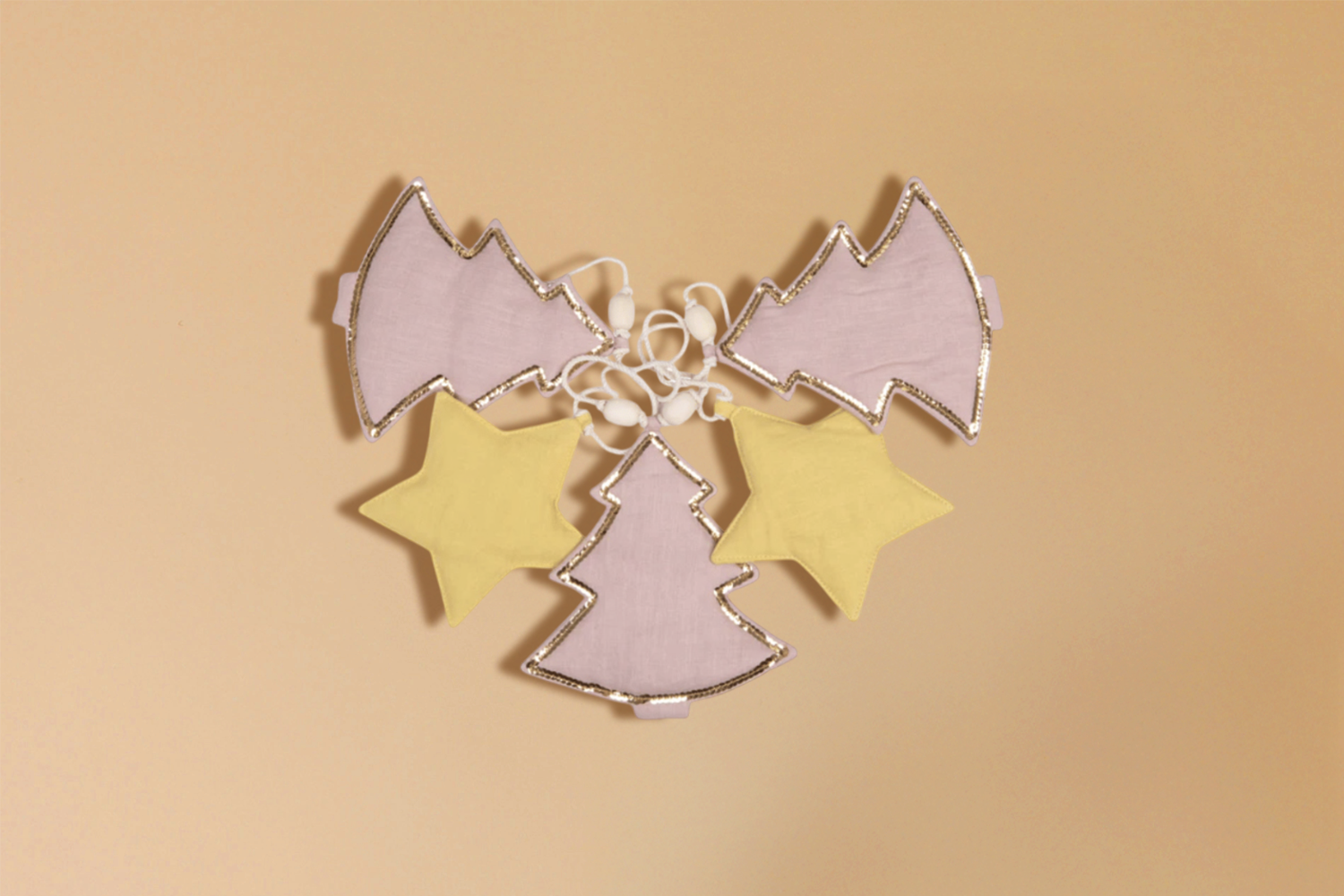 Composto da 3 alberi di natale rosa adornati con paillettes dorate e 2 stelle beige.