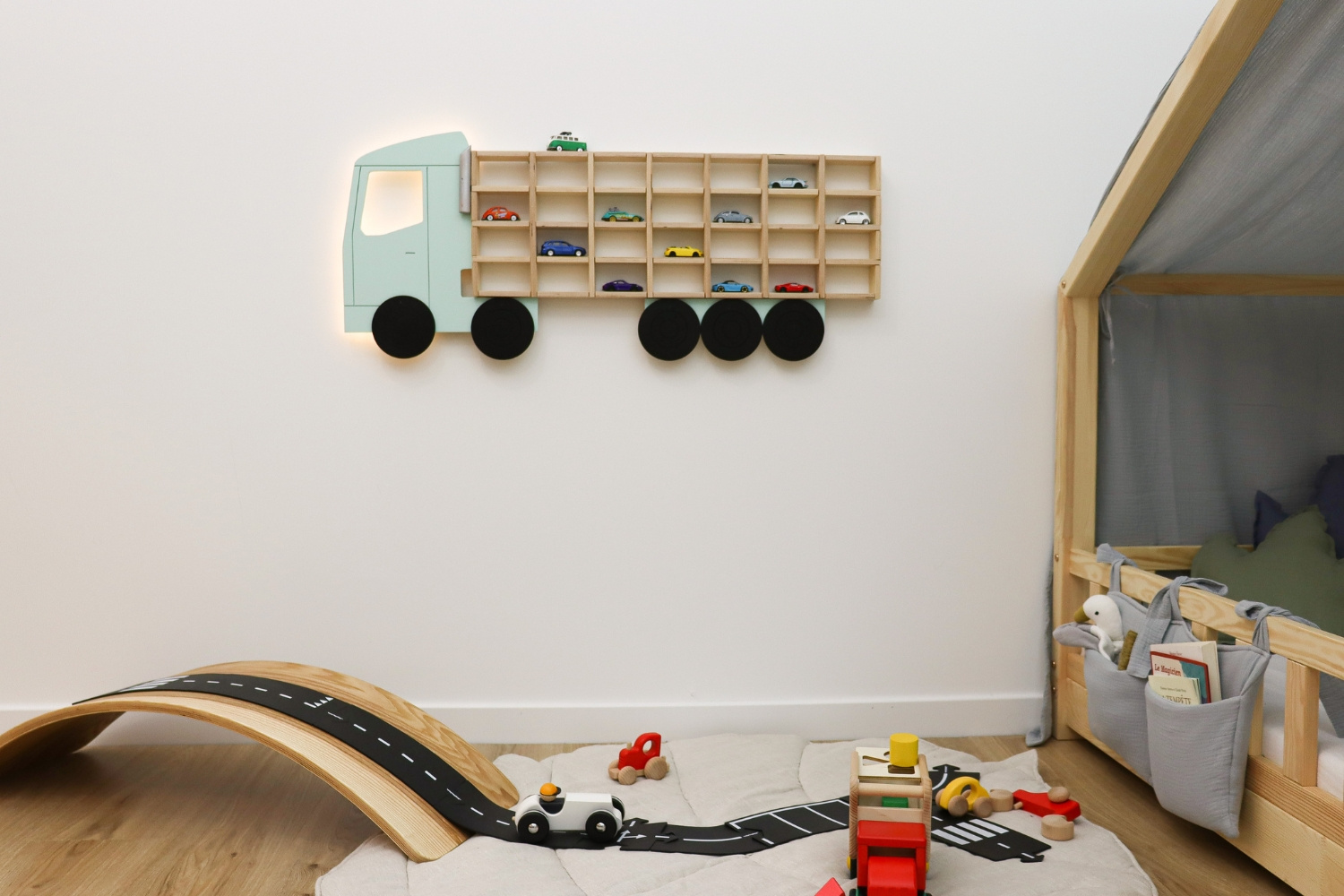 Quale modo migliore per conservare le macchinine di tuo figlio di questa bellissima mensola a forma di camion! La ciliegina sulla torta? La cabina è illuminata e può essere utilizzata come lampada, il che le conferisce una doppia utilità!
