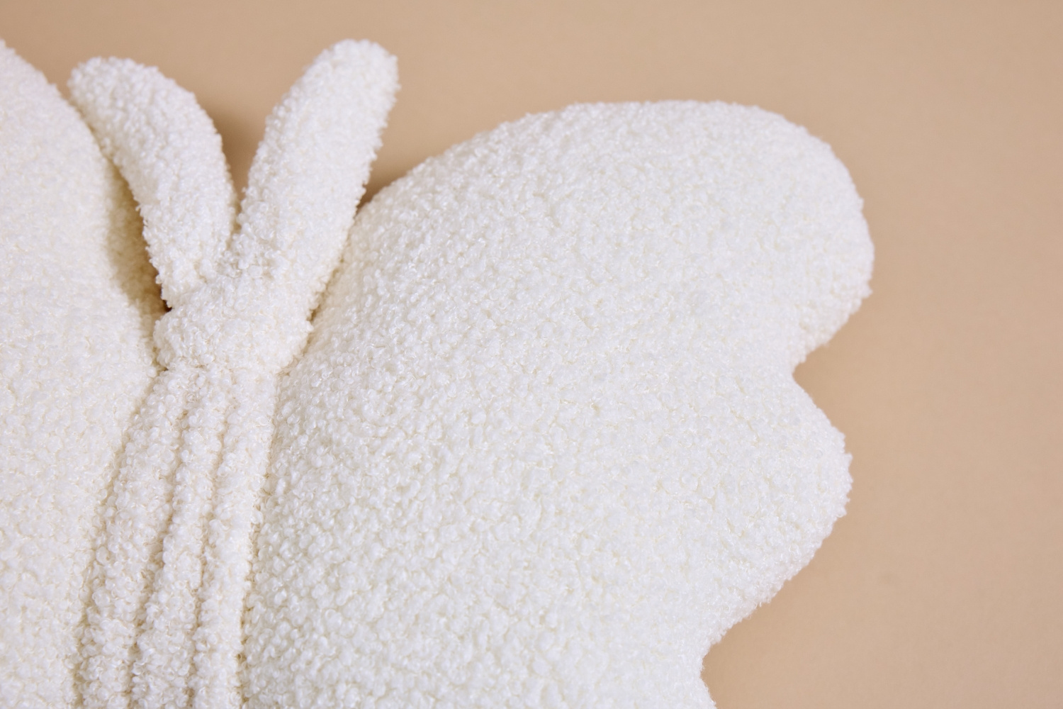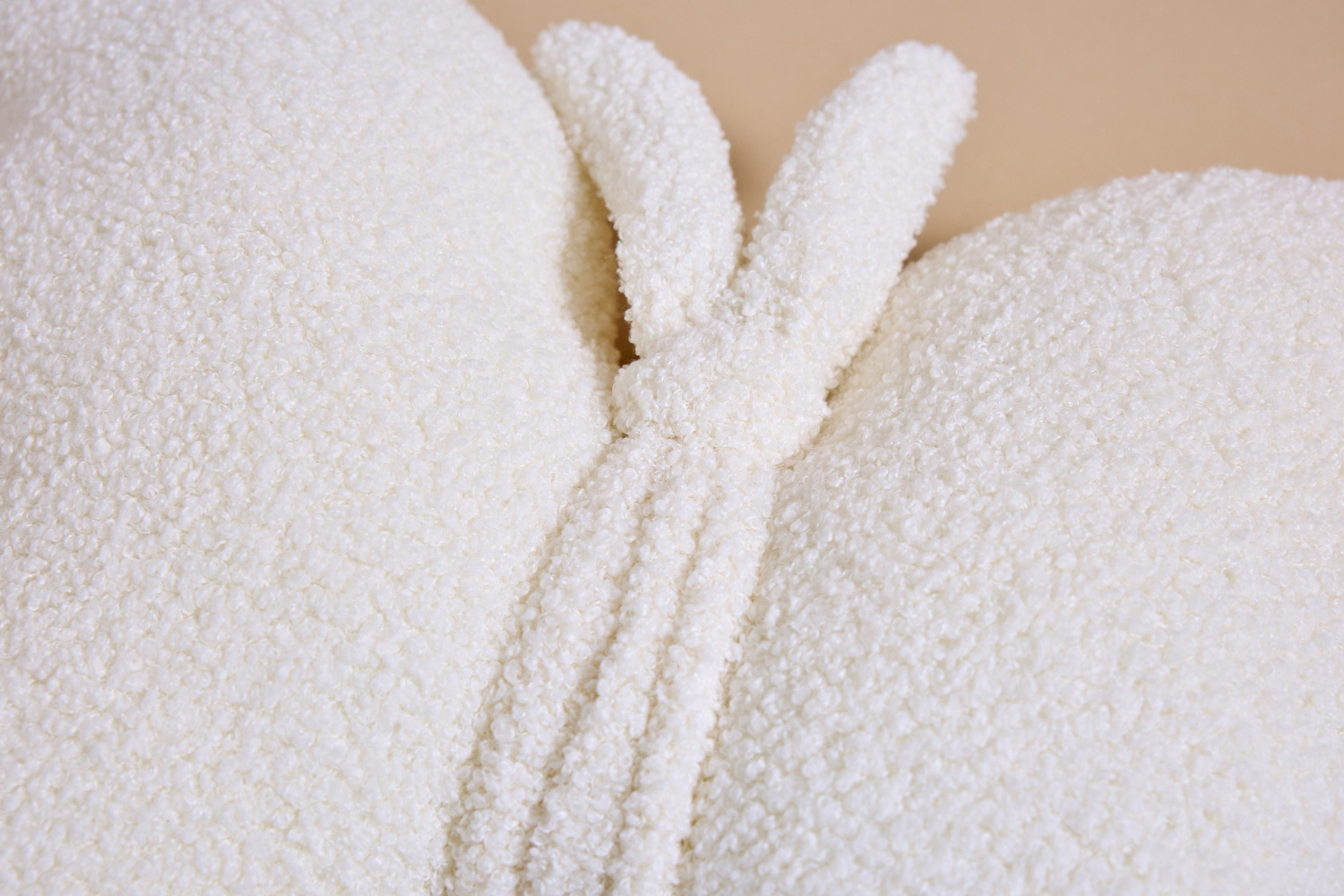 Fabricada em tecido bouclé macio, também pode servir como um grande peluche.