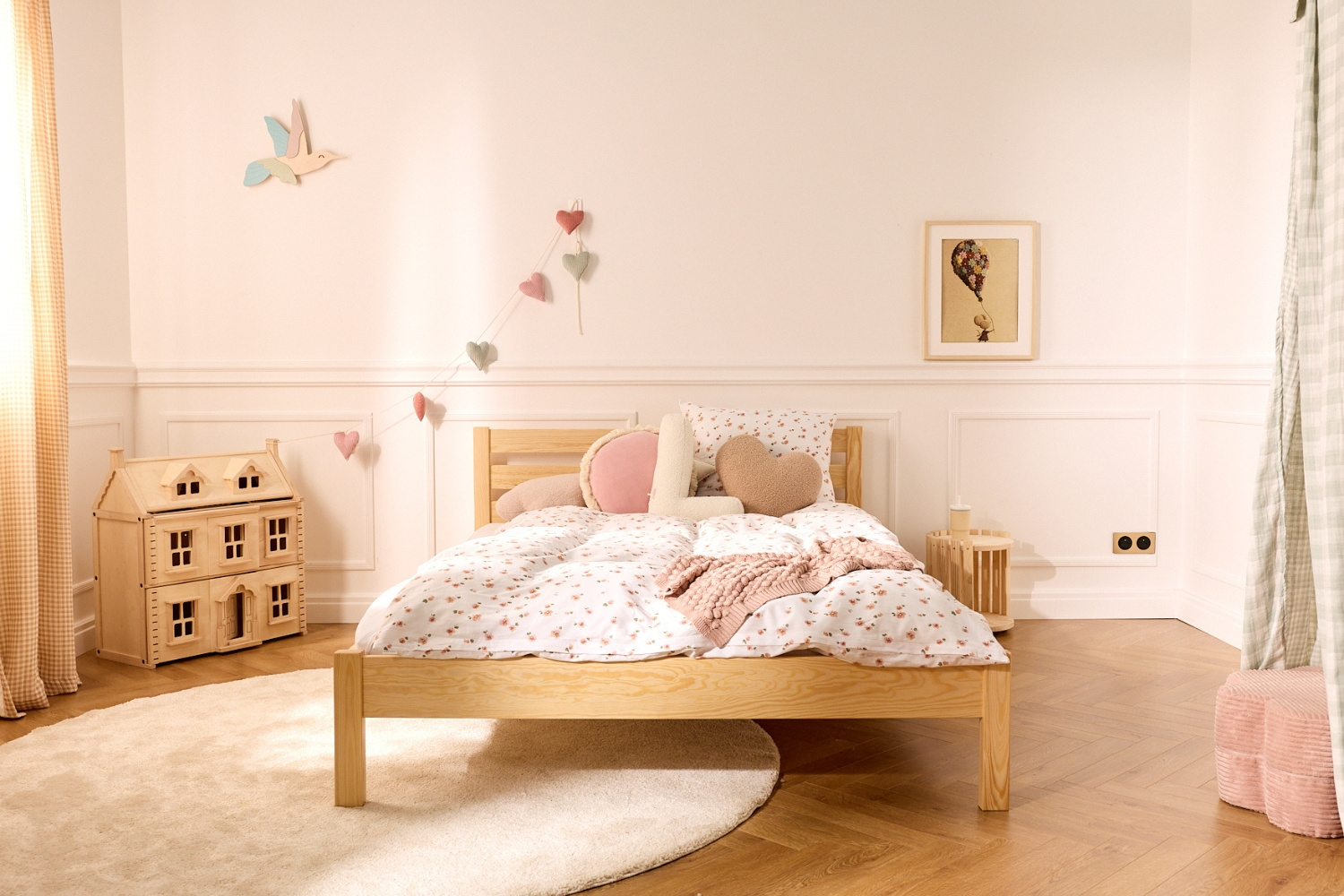 A cama está coberta com uma fina camada de verniz transparente que protege a madeira e preserva o seu tom natural, oferecendo um ligeiro brilho e facilidade de limpeza.
