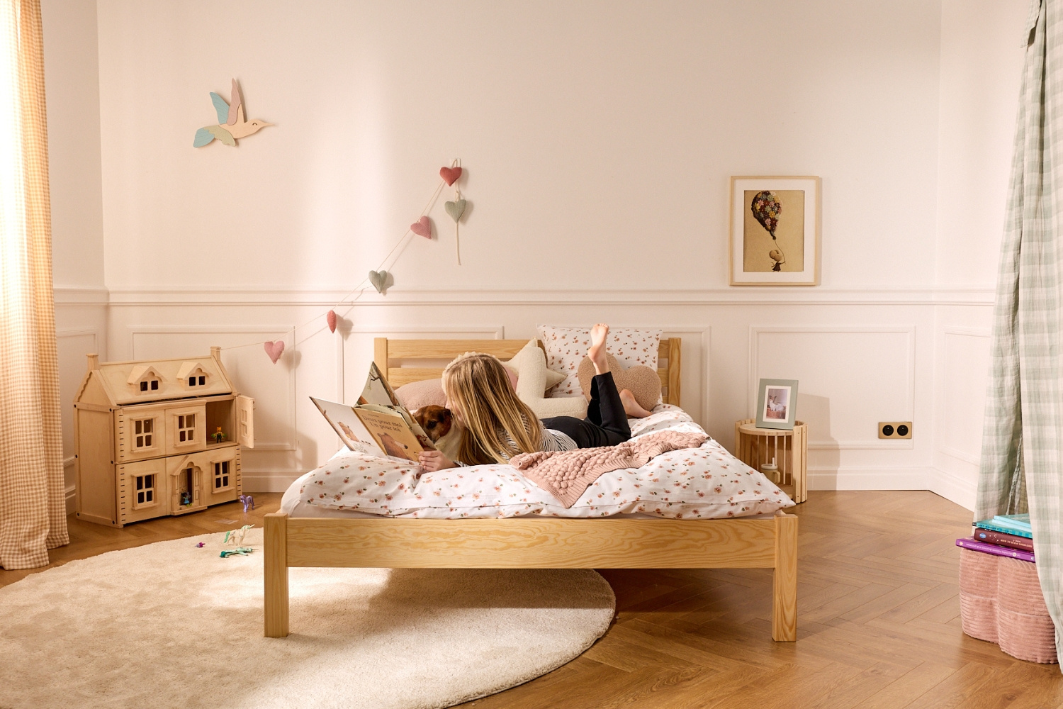 A cama está coberta com uma fina camada de verniz transparente que protege a madeira e preserva o seu tom natural, oferecendo um ligeiro brilho e facilidade de limpeza.
