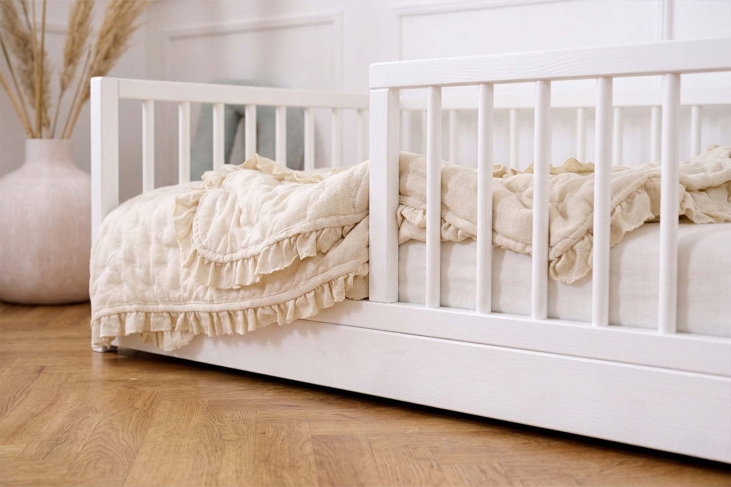 Colocada diretamente no chão, permite que a criança entre e saia da cama livremente. É a solução perfeita para os pequenos que estão aprendendo a ser independentes e explorando o mundo ao seu próprio ritmo. O perfil baixo elimina o risco de quedas enquanto garante conforto durante o sono. Além disso, as bordas arredondadas e a estrutura sólida feita de materiais de alta qualidade garantem a segurança do seu pequeno.