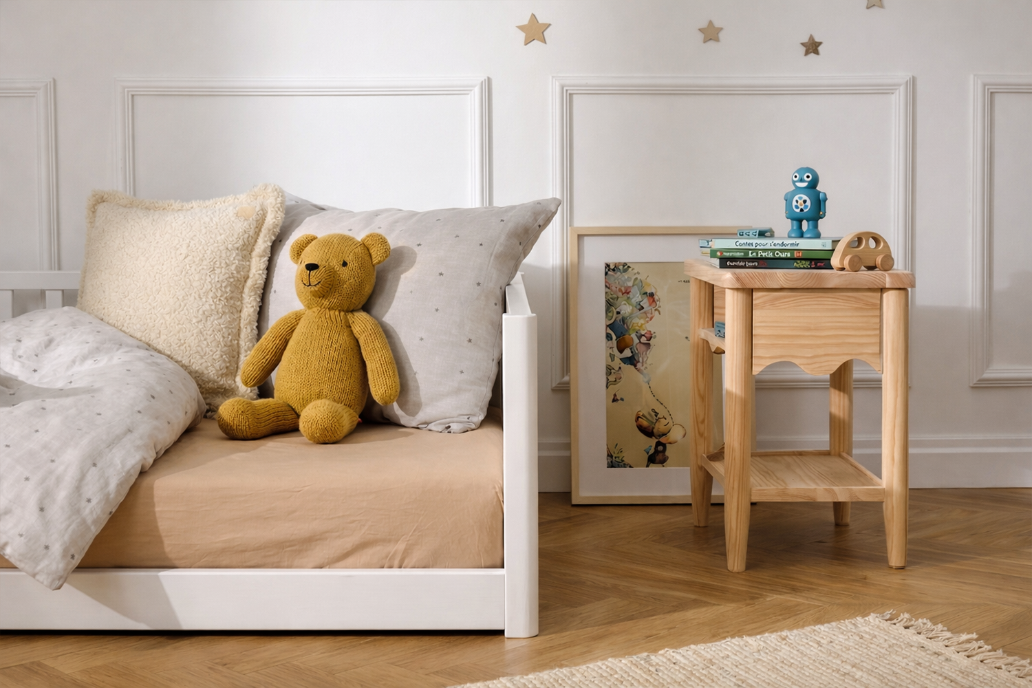 A cama infantil Maia é uma peça única projetada para apoiar o desenvolvimento do seu filho, alinhada à filosofia Montessori. Graças ao seu design cuidadoso, a cama oferece conforto e segurança, incentivando ao mesmo tempo a independência.