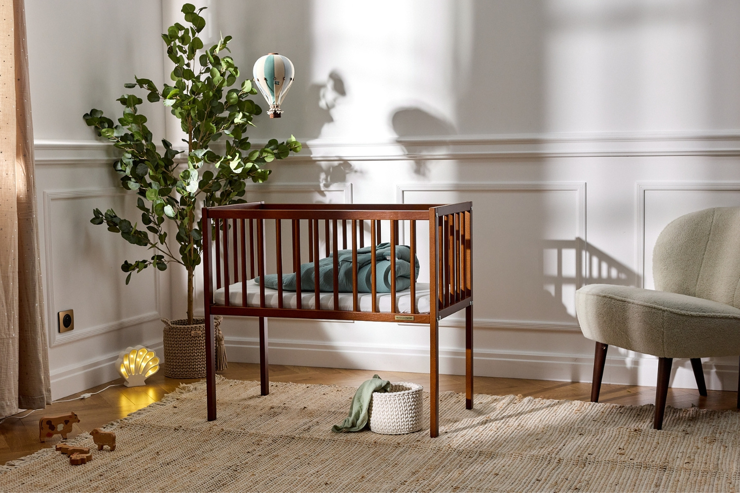 Este modelo de berço é fabricado em madeira de faia ecológica de alta qualidade. Projetado com cuidado e protegido com verniz ecológico certificado, a madeira de faia garante maior resistência e durabilidade. O fundo em ripas proporciona estabilidade e melhor ventilação para o colchão.