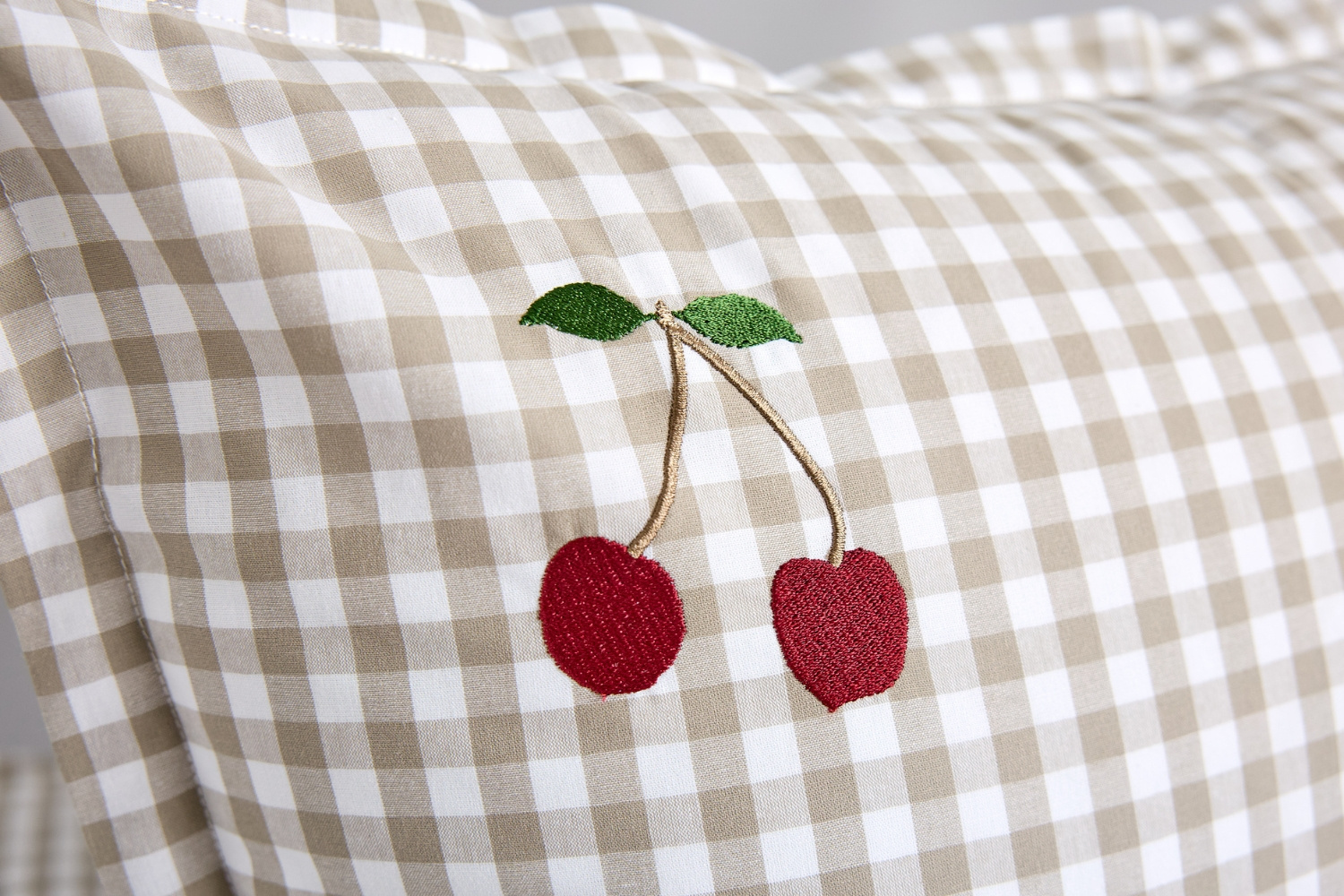 O nosso encantador conjunto de cama infantil em algodão xadrez, com um delicado bordado de cerejas, é feito com o algodão da mais alta qualidade.