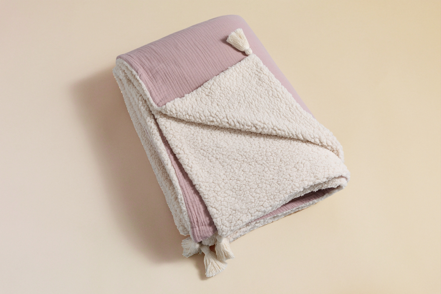 Cobertor de Musselina de Algodão e Bouclé de Dupla Face - Rosa Pó