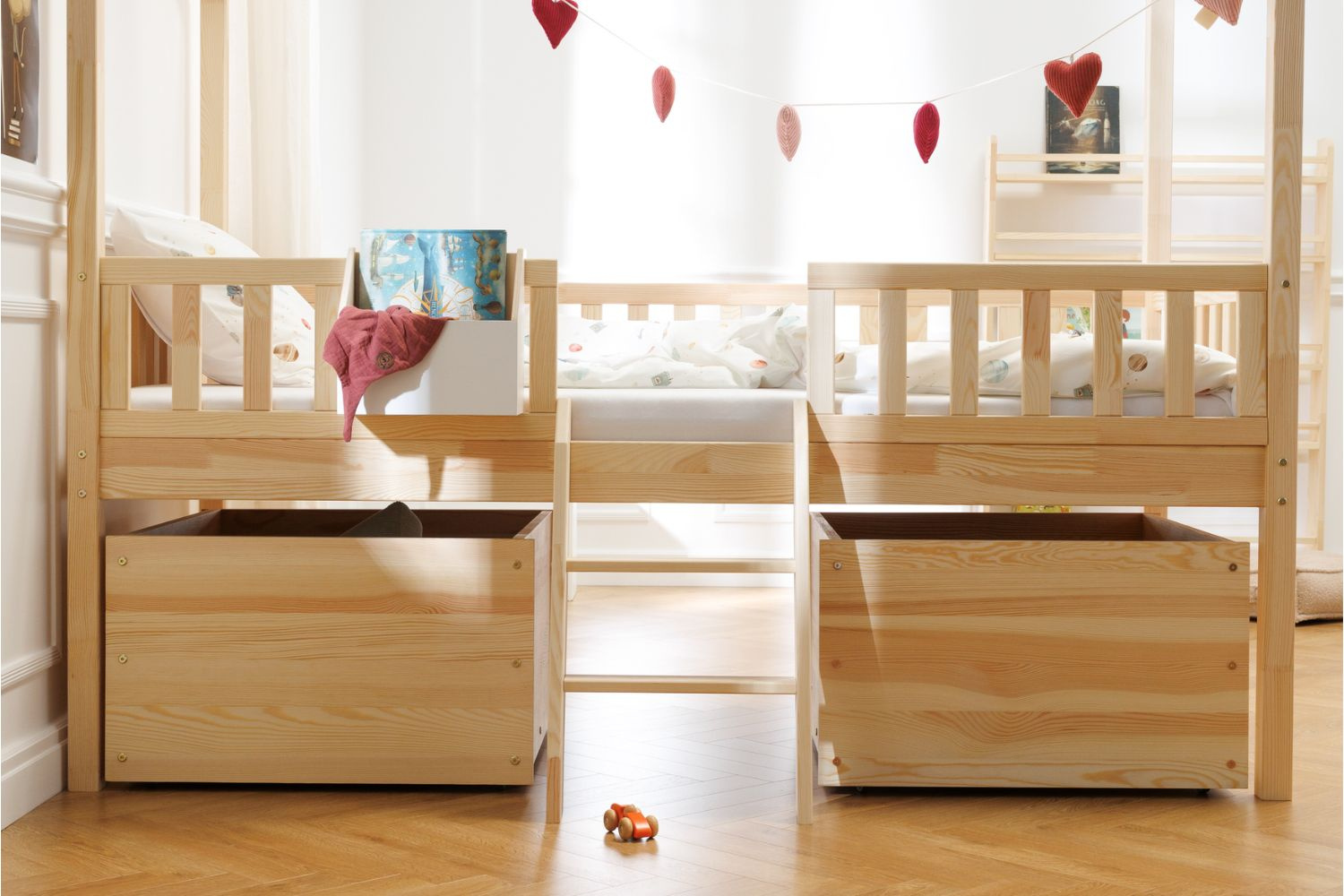 Projetada para deslizar diretamente sob a cama, proporciona um volume ideal para guardar brinquedos, livros, roupa de cama ou acessórios do dia a dia. A sua estrutura em madeira natural não tratada harmoniza-se perfeitamente com as nossas camas e acrescenta um toque acolhedor ao ambiente.