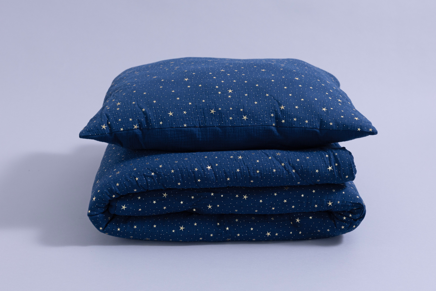 Conjunto de edredão e almofada em musselina de algodão 120x170 com enchimento - Azul marinho estrelas douradas