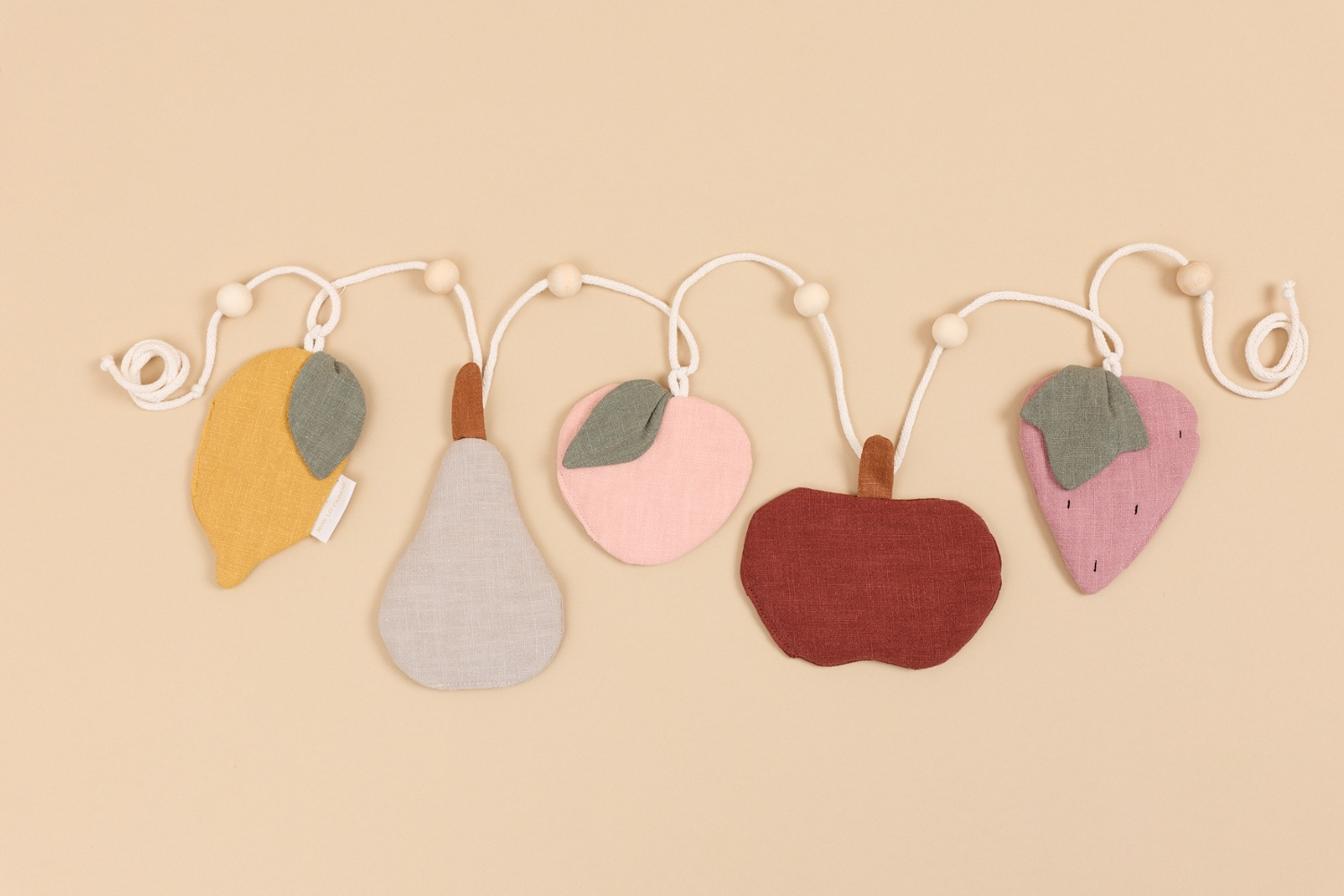 A decoração é composta por um limão, uma pera, um pêssego, uma maçã e um morango de linho, bem como contas de madeira natural ligadas por uma corda de algodão.