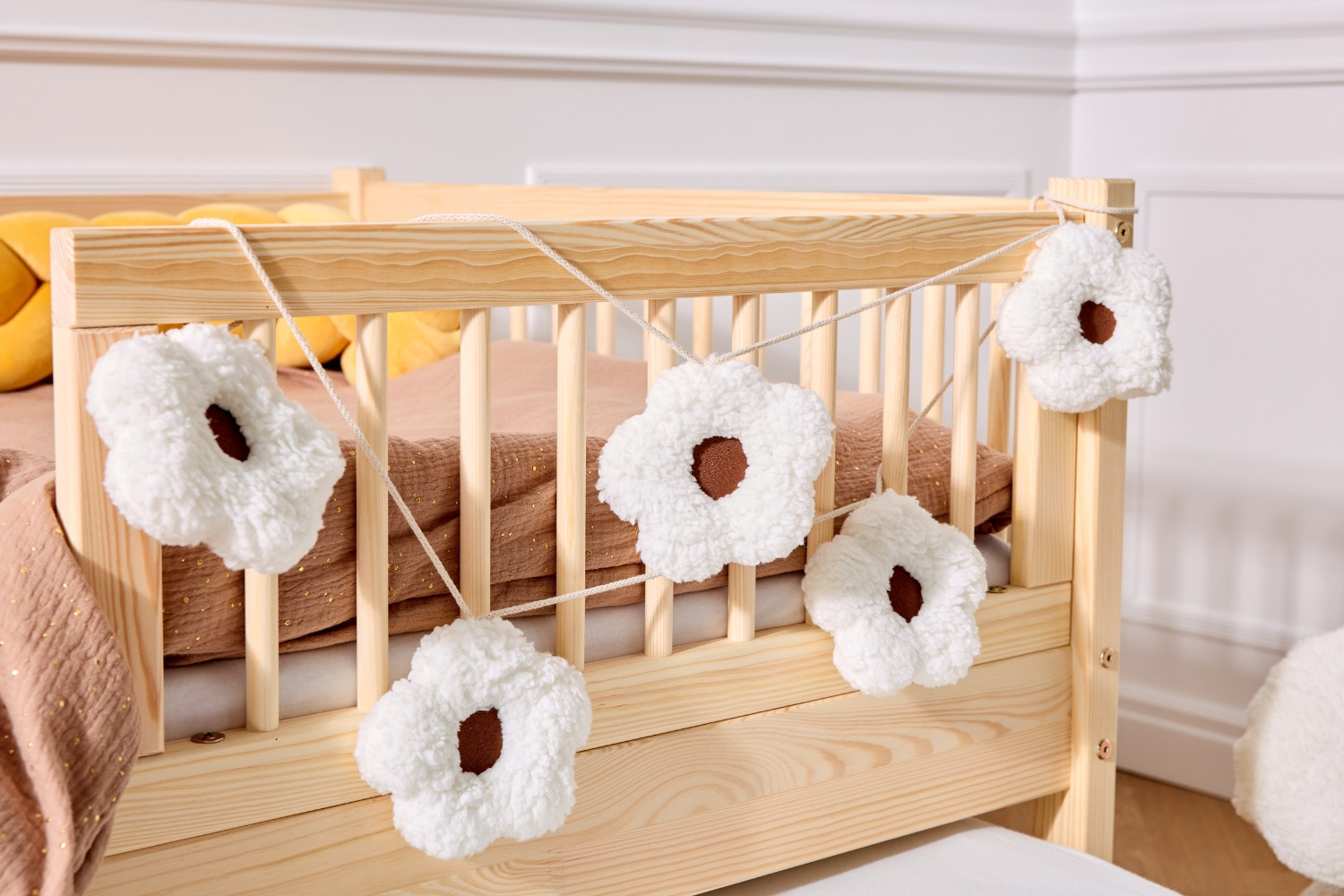 A guirlanda possui cinco margaridas feitas à mão com cuidado, espaçadas uniformemente ao longo de uma corda de 2,6 metros.
