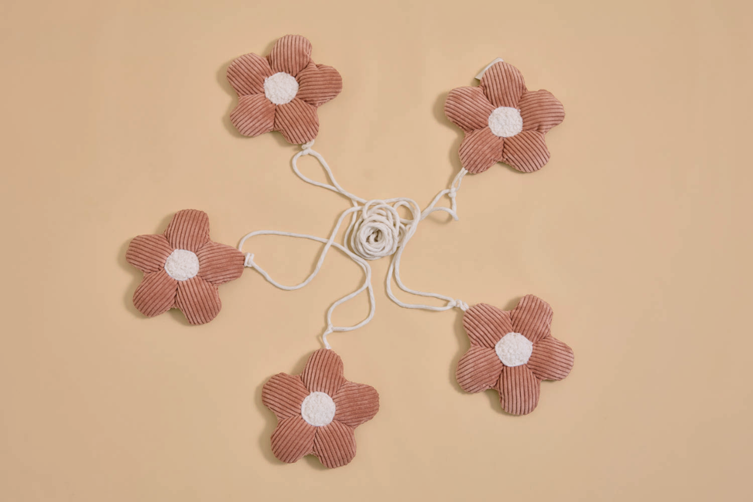 A guirlanda possui cinco margaridas feitas à mão com cuidado, espaçadas uniformemente ao longo de uma corda de 2,6 metros.