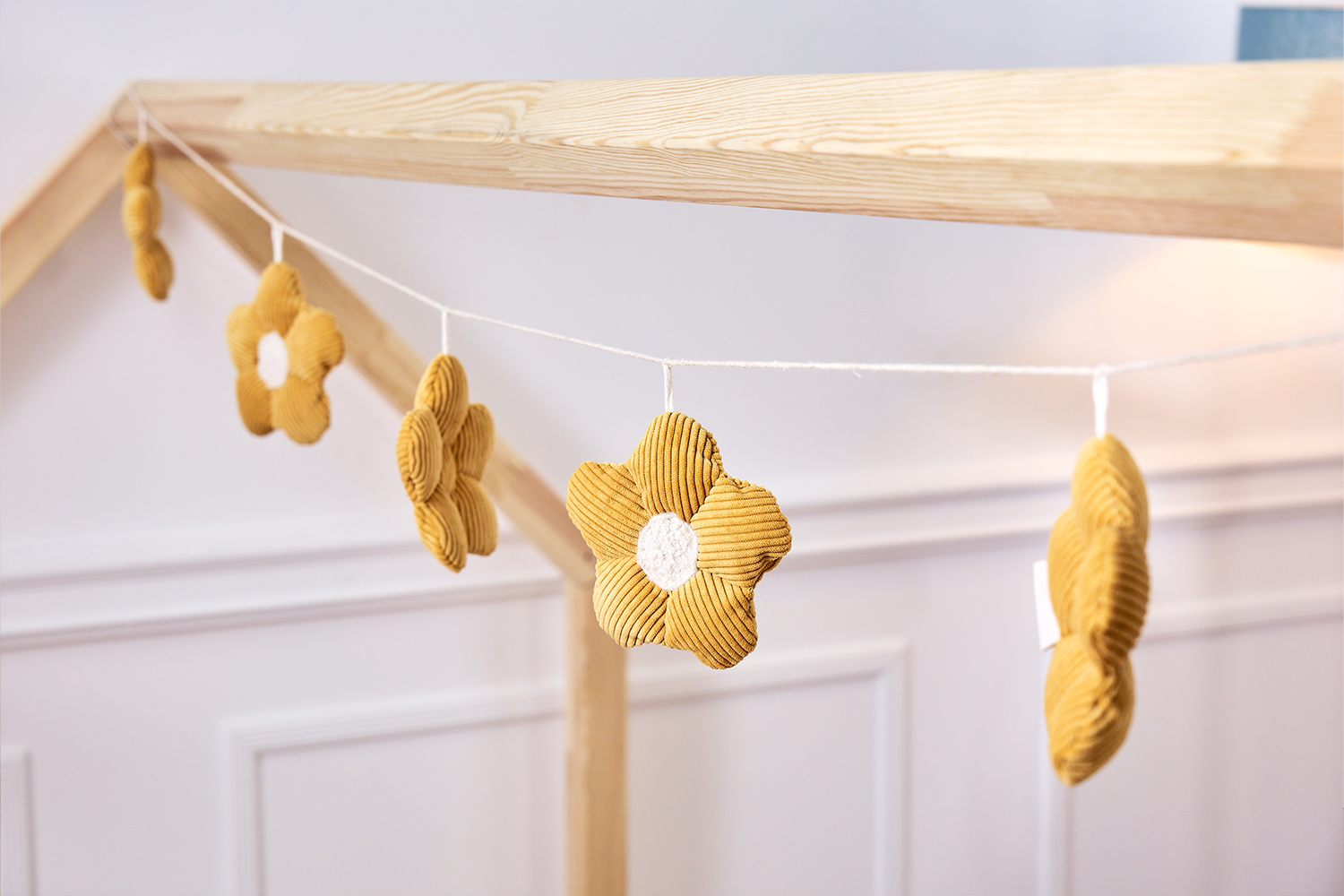 A guirlanda possui cinco margaridas feitas à mão com cuidado, espaçadas uniformemente ao longo de uma corda de 2,6 metros.