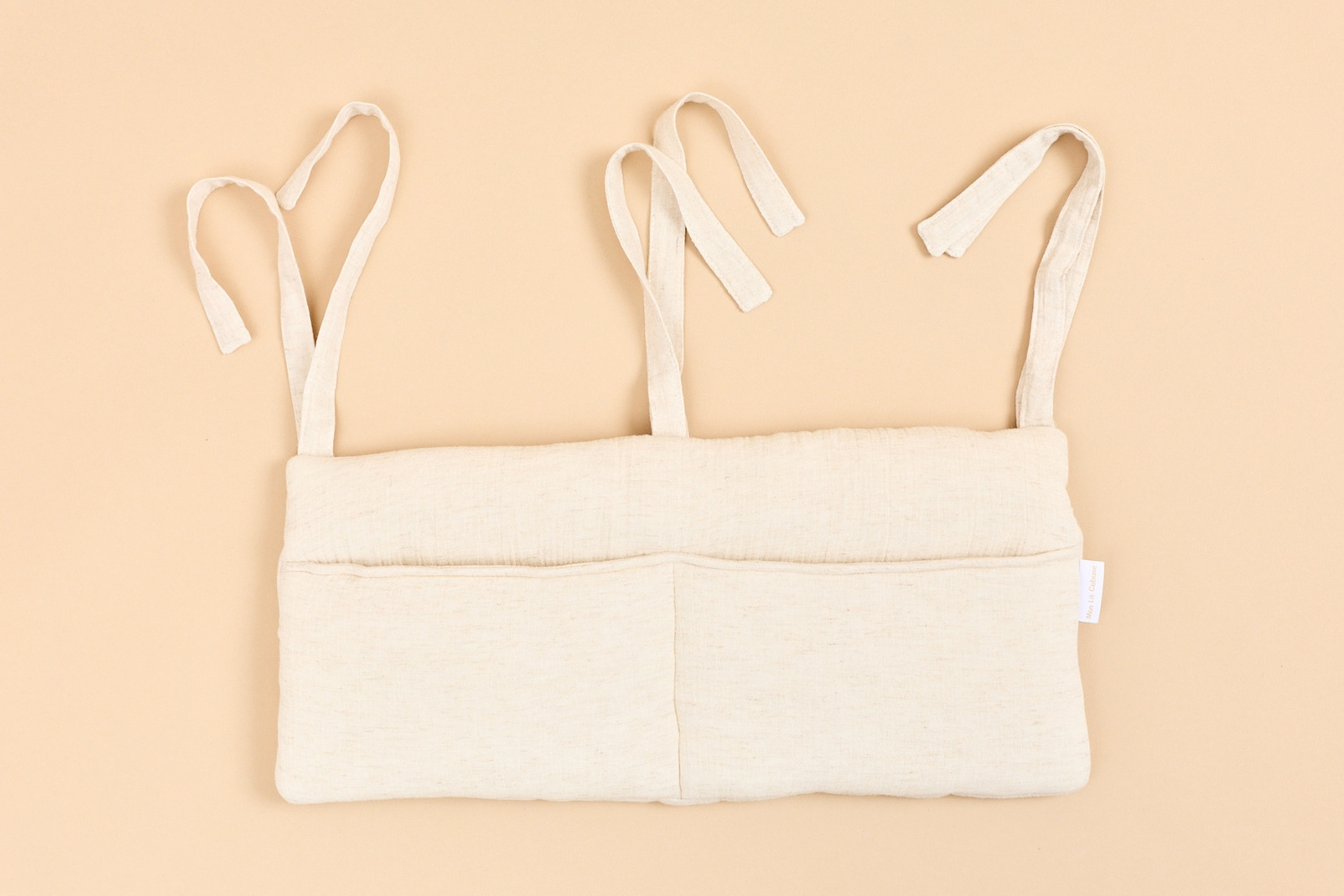 Fixada às grades da cama com pequenos laços, é também um bonito elemento decorativo: os seus 2 bolsos profundos permitem guardar facilmente pijamas, biberões e livros.