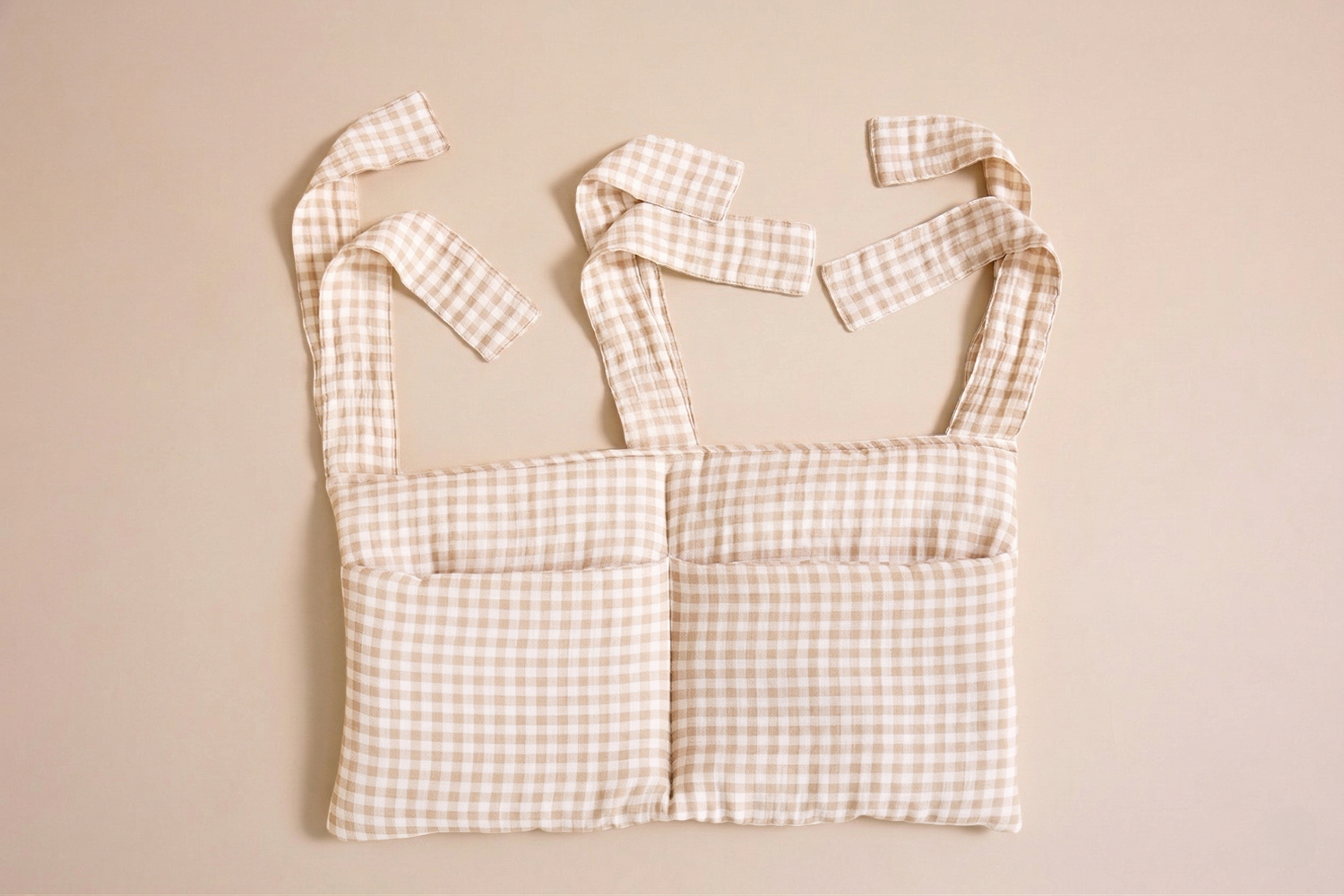 Anexado às barreiras da cama usando pequenas amarrações, é um belo elemento decorativo, os seus 2 bolsos fundos facilitam o armazenamento de pijamas, biberões e livros por perto.