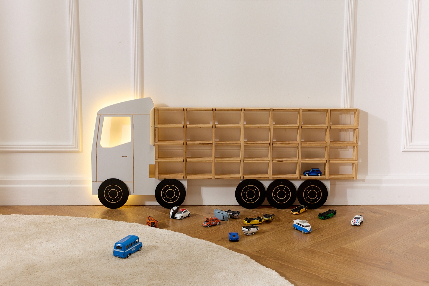 O que tem de melhor para guardar os carrinhos do seu filho que esta linda prateleira em forma de caminhão? Ainda mais, a cabine é iluminada e pode ser usada como lâmpada, um duplo uso!